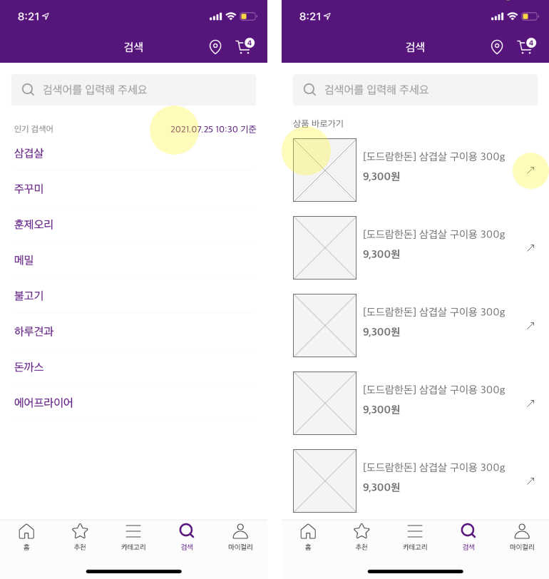 [๊ฒ์] ๋ฒํผ์ ํฐ์นํ์ ๋ ์ํ์ด ํ์๋๋ ํ๋ฉด์ด๋ค.